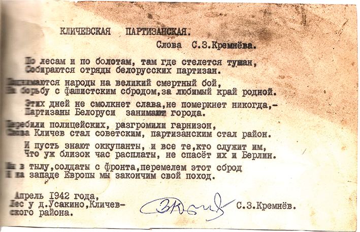 Command body of the Klichaw Partisan Formation which operated in the invaded territory of Magiliow Voblasc (west of the Dniapro River) and some neighbouring rajons of other voblascs during the Great Patriotic War.