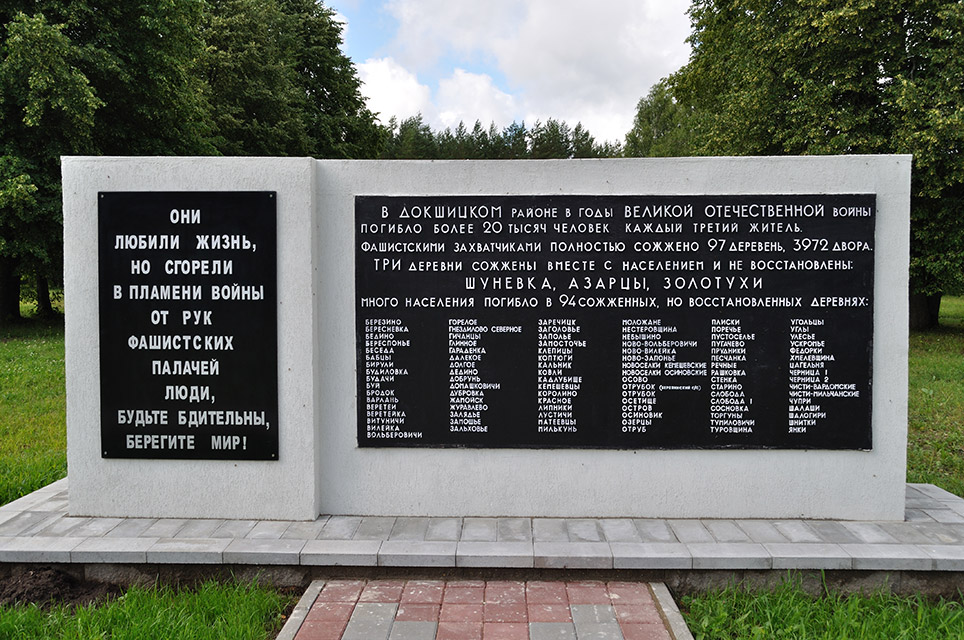 Village in the territory of Dokshycy Rajon, Viciebsk Voblasc, destroyed along with its inhabitants by German Nazi invaders during the Great Patriotic War.