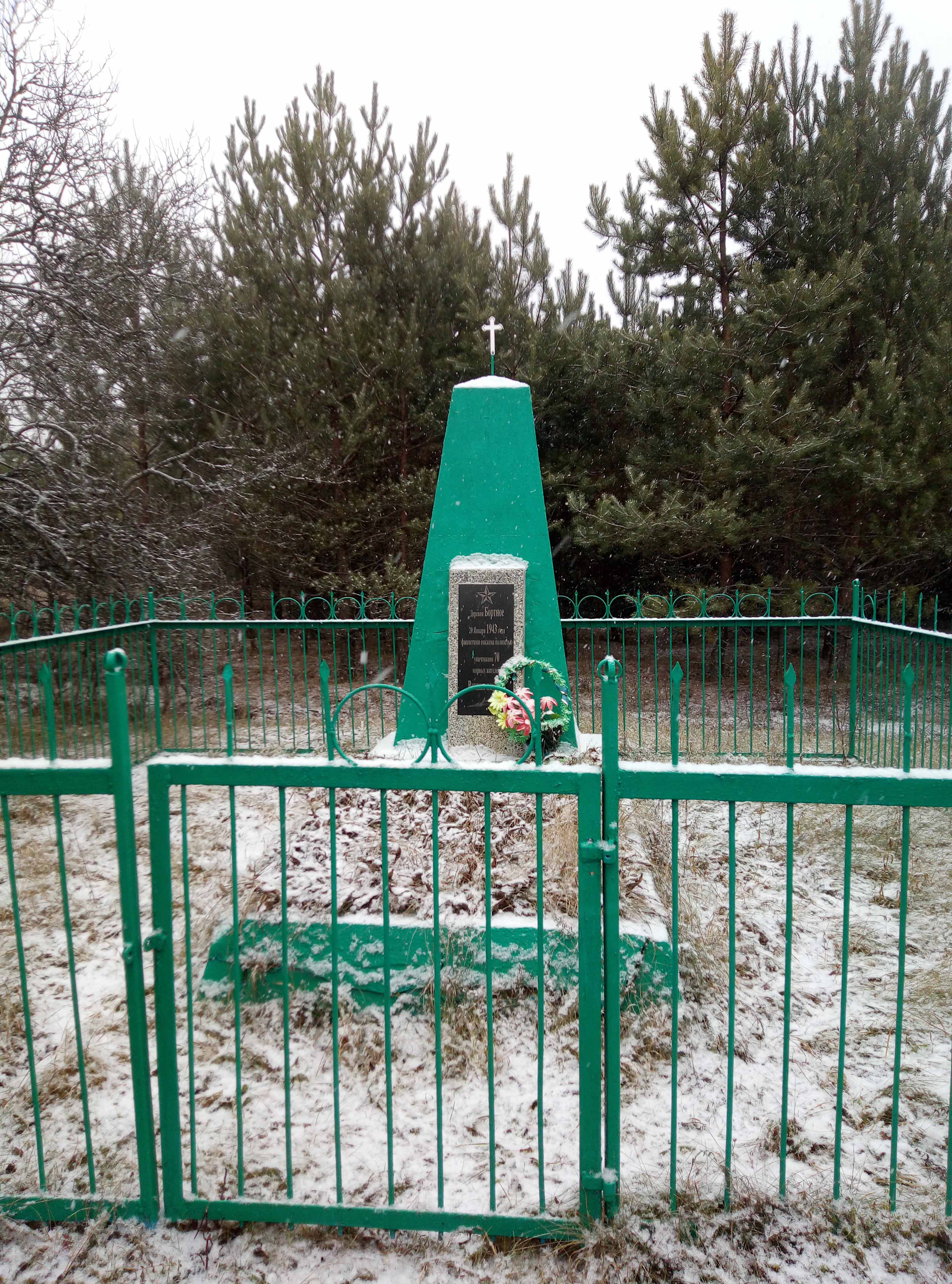 In January 1943, during the Franz punitive operation, the Hitlerites killed 98 inhabitants and burned the village (18 homesteads).