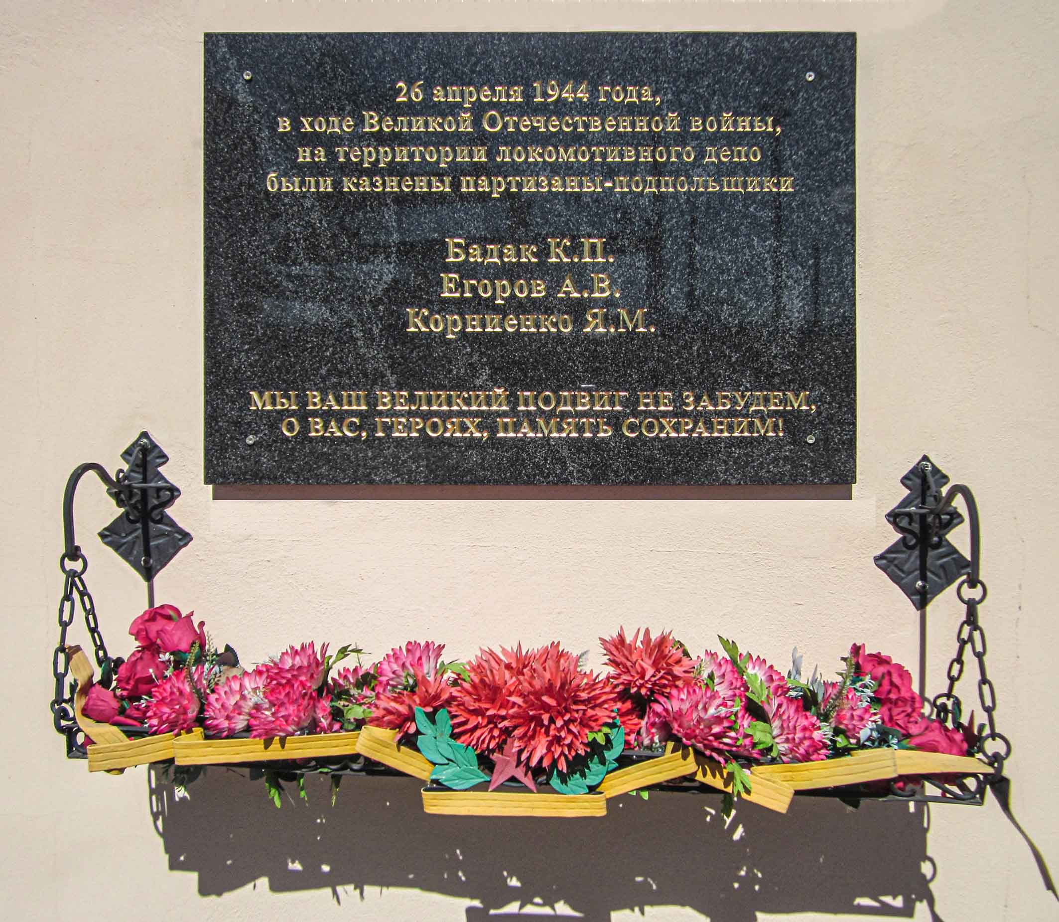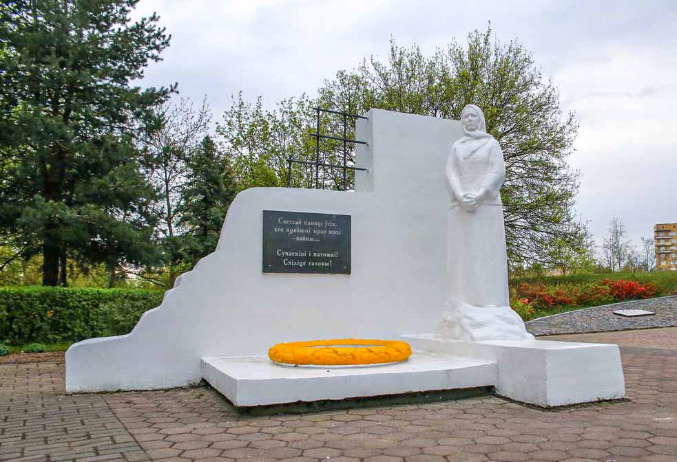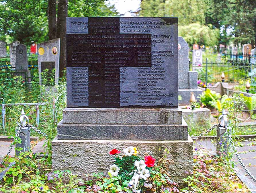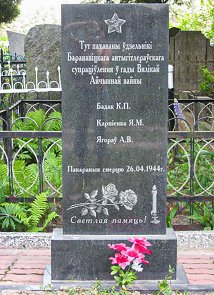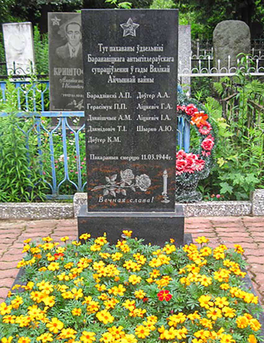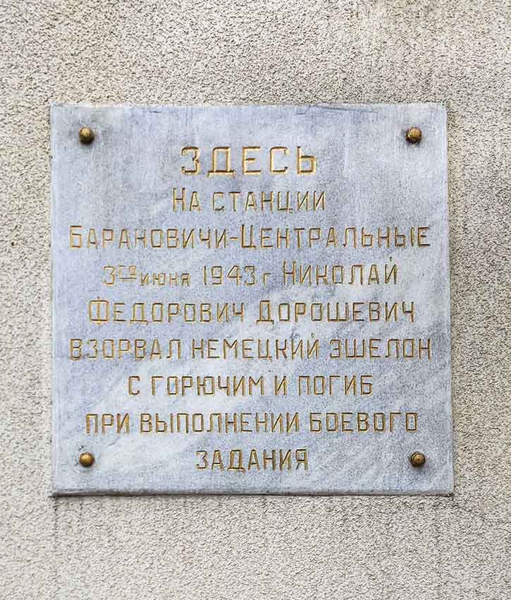 memorial plaques in honour of Heroes of the Soviet Union A. G. Nakonechnikov, I. P. Lisin, A. I. Kazakov, U. Z. Tsaruk, A. G. Frolenkov, V. E. Chernyshov, I. K. Kabushkin, Ja. F. Pavlov; underground members L. P. Baradzinski, M. F. Darashevich; Marshal of the Soviet Union G. K. Zhukov; Marshal of the Soviet Union K. K. Rokossovskij; major general I. L. Ragulia who died during the liberation of Baranavichy; were installed in honour of the underground members at the place of their death; the fascism victims (ghetto prisoners executed in March 1942 near the Zialiony Most [green bridge] on the city skirts).